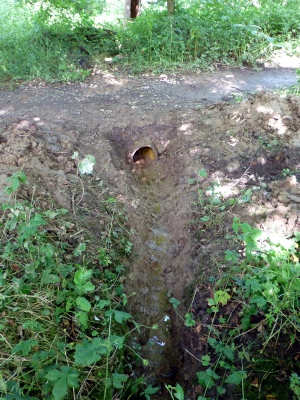 Another unfinished job was the blocked drainage pipe in the dip east of Holywell Bridge. Two days after our normal Tuesday working session, (5 Jul) a volunteer spent an hour and a half unblocking the pipe. Having dug down through the silt to the pipe entrance he found the problem, which was a cycle wheel that was over the pipe entrance and had helped the silt to build up.