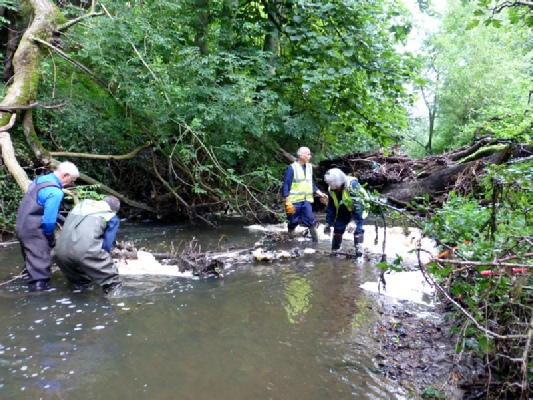 Meanwhile the second group of volunteers was tackling the very large river blockage upstream near the downstream wooden bridge. The aim of the volunteers was to remove the build up of logs, branches and litter so that the basics of the jam could be ascertained.