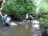 By mid-morning all ten volunteers had joined up and considerable manpower was available to cut up or move whole, the medium sized logs on to the riverbank. This still left the three fallen trees in or across the water but at least a clear water channel had been created.