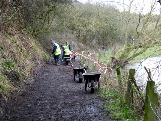 Of all the tasks undertaken by the working party, litter picking is probably the least enjoyable but just as important as other work carried out by the group. So the volunteers set off with bags, litter pickers and a wheelbarrow along the very muddy path by the riverside.