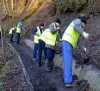 The first site, nearest to the camera in the next photograph, was a pipe that had become blocked due to the silt, which this winter’s heavy rain, had brought down the hillside. Using drain rods from the river end, the pipe was quickly cleared but the sump had also to be cleared of silt and, as can be seen, a volunteer wearing rubber pond gloves performed this. A worthy effort!