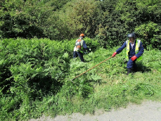 Photograph 1. Strimming and raking bracken