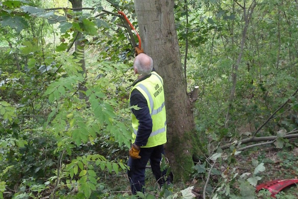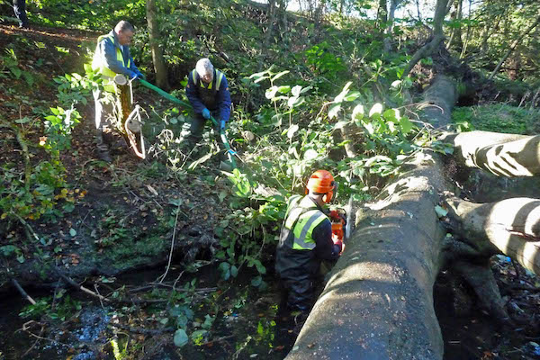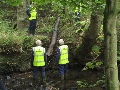 During our break we had discussed the size of the sycamores in the area and how they cut out a great deal of light so, whilst the winching was going on, 2 of the team set about removing the lower branches that were growing over and adjacent to the bridge. The improvement was commented on positively by several passing dog walkers.