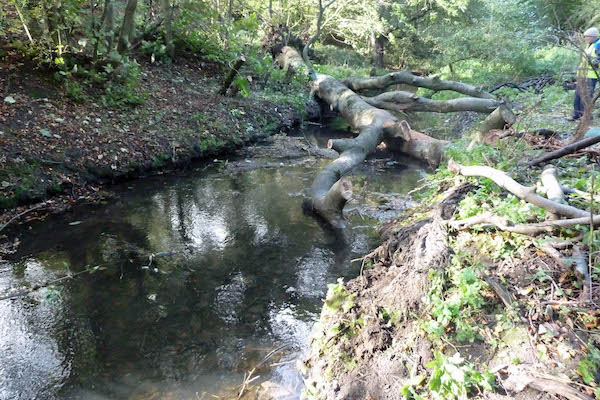 The blockage consisted of branches and twigs that had been washed downstream and got stuck against a long-fallen beech tree. Clearing this blockage took till mid-morning.