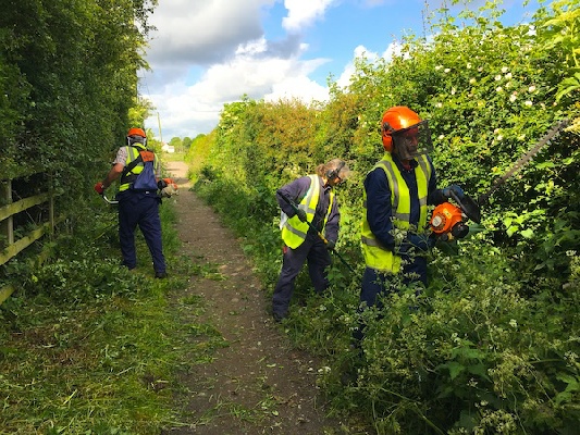 Once loaded up, with our safety gear on, we set off to the areas that needed our attention. The first area was the sloping path near the stepping stones that takes you up to the top road (the “M1”). One pair started at the bottom of the incline, another went to the top, and the last pair strimmed along the bottom pathway. The seventh person used the hedge cutter to remove branches that were obstructing the pathways.