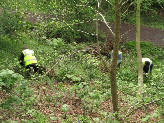 We loaded up with the tools and walked to the Holywell Bridge path. There, we split into two teams of three, and took a side of the Dene each.