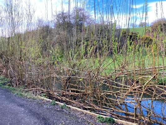 The cut stems were then used to construct a willow barrier to block off a doggie-slide. Some thicker stems were cut to a suitable length and pushed into the soil of the river bank. These verticals were then inter-woven with thinner willow wands to produce a basket-like effect.