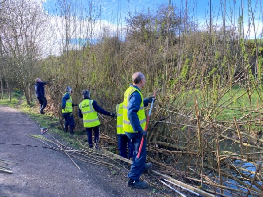 We then set about pruning the willows. These grow long, whippy stems every year. Loppers and bowsaws were used to cut these down to a reasonable height. Meanwhile, one of us put on waders and got into the river to prune the willows at water’s edge (and to remove litter, and to plant willows on the other bank).