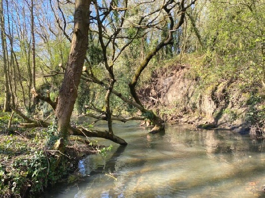 A working party of nine volunteers gathered near Hartley West Farm this morning for another river clearance session, on a fine sunny day – with birds singing and spring flowers blooming.
