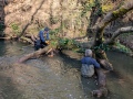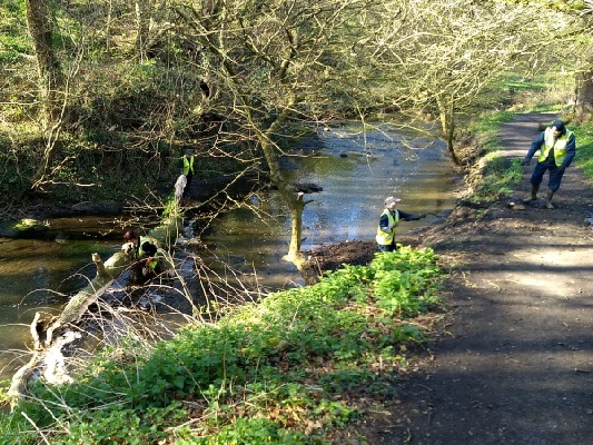 Storm Dave had done its worst and blown two trees into the river. The first one was just upstream of the waterfall. We couldn’t get the main trunk out, but, after removing branches, we winched it to the side of the river. The river is not all that deep at that point so waders weren’t needed (although wellies were).